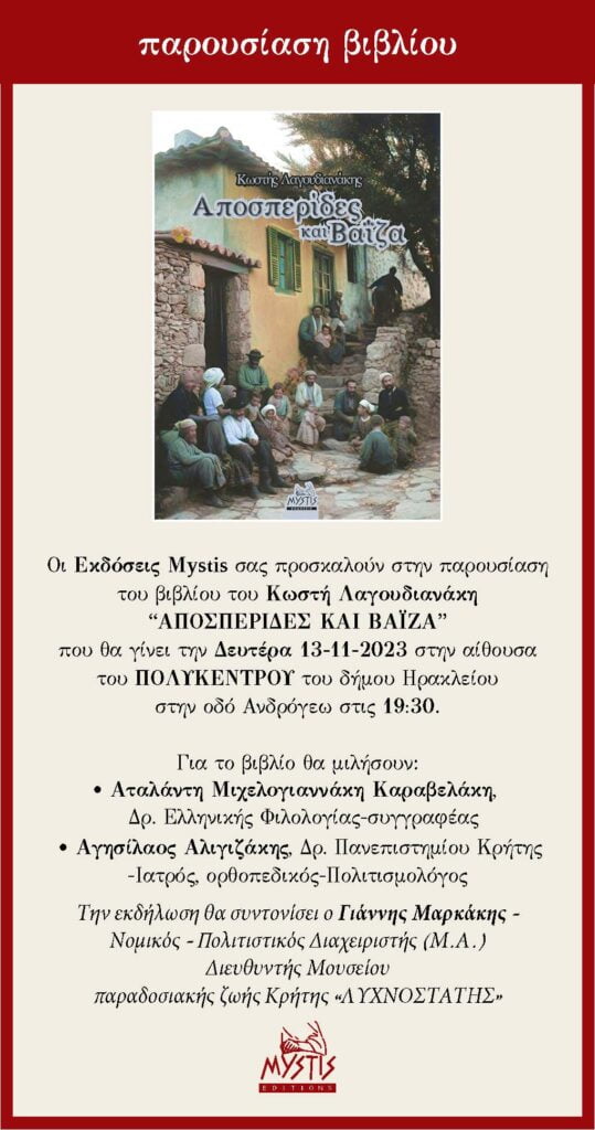 Οι Εκδόσεις Mystis σας προσκαλούν στην παρουσίαση του βιβλίου του Κωστή Λαγουδιανάκη “ΑΠΟΣΠΕΡΙΔΕΣ ΚΑΙ ΒΑΪΖΑ” που θα γίνει την Δευτέρα 13-11-2023 στην αίθουσα του ΠΟΛΥΚΕΝΤΡΟΥ του δήμου Ηρακλείου στην οδό Ανδρόγεω στις 19:30.